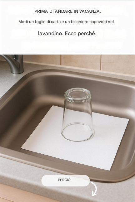 Quando pensiamo a come prepararci per una vacanza, spesso pensiamo a prenotare un hotel, preparare la valigia, controllare i documenti, programmare il GPS o annaffiare le piante mentre siamo via. Ma c'è un gesto discreto, quasi invisibile, che può proteggerci da una spiacevole sorpresa al ritorno: mettere un bicchiere capovolto su un foglio di carta nel lavandino.
