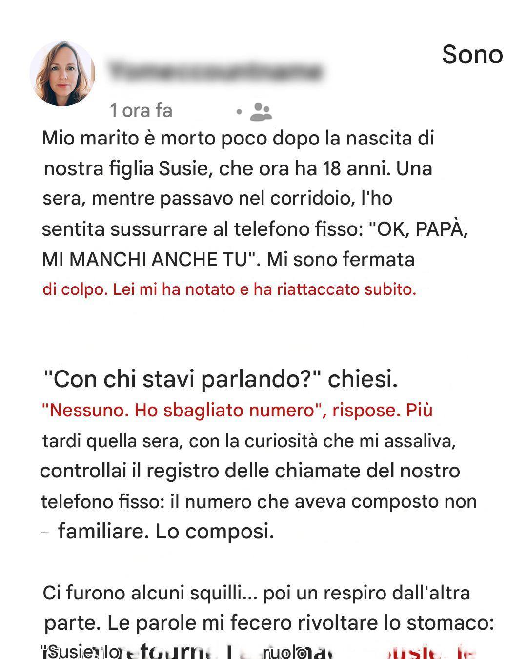 Annuii semplicemente mentre il funerale procedeva dietro una bara chiusa. Insistette per una cremazione rapida. Fu lei a prendere le decisioni. Rimasi a letto, tenendo in braccio Susie, lasciando che Diane lisciasse le crepe nel mio mondo come carta da parati su muri marci.