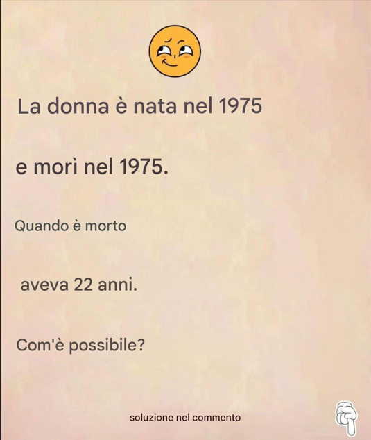 Immagina questo: ti imbatti in questa strana frase mentre sfogli le notizie. "Una donna è nata nel 1975 ed è morta nel 1975. Aveva 22 anni". Ti blocca di colpo. Incomprensibile? Confuso? C'è sicuramente qualcosa che non va da qualche parte... Ma dove? Aspetta, perché questo indovinello mette alla prova la nostra logica, i nostri riflessi e richiede un po' di immaginazione. E se la chiave non fosse semplicemente pensare come pensiamo normalmente?