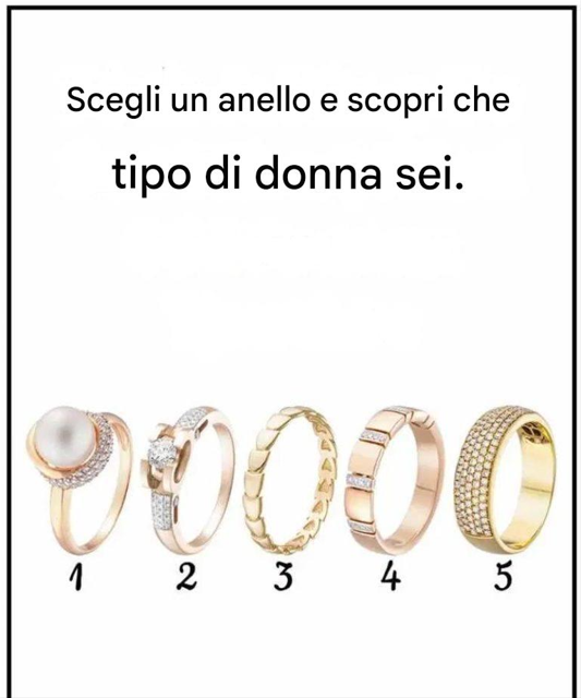Guarda i cinque anelli nell'immagine qui sopra e scegli quello che ti parla immediatamente. Non pensarci troppo; scegli quello più adatto a te. Una volta fatta la tua scelta, leggi la descrizione qui sotto per scoprire cosa dice la tua scelta sul tipo di donna che sei.