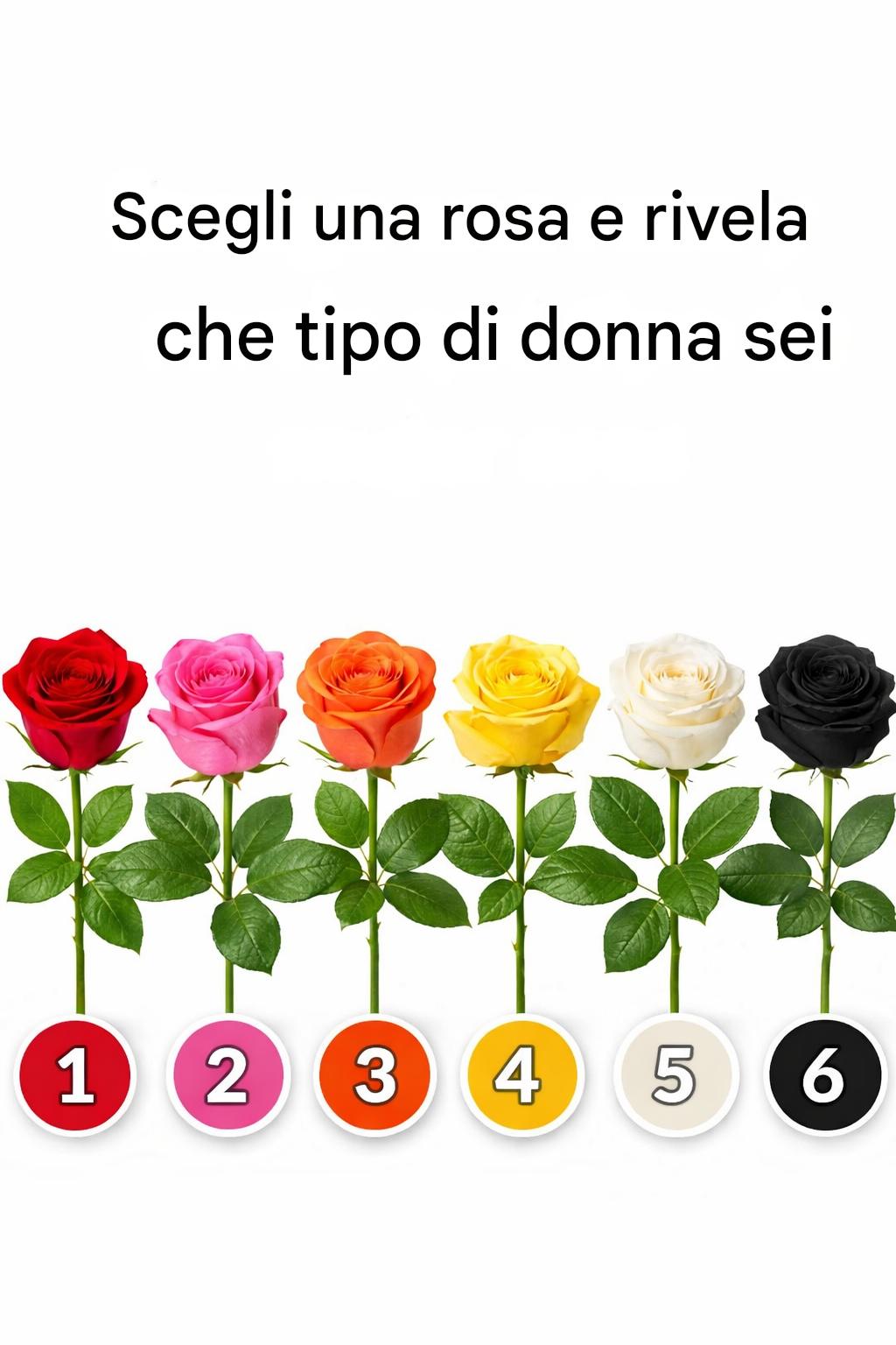 A volte, le decisioni che prendiamo, anche le più semplici, possono riflettere aspetti più profondi della nostra personalità. I colori, in particolare, spesso si collegano alle nostre emozioni, ai nostri valori e alla nostra visione del mondo. Prenditi un momento, osserva le rose nell'immagine e scegli quella che ti attrae di più. La tua scelta potrebbe rivelare qualcosa di interessante sul tipo di donna che sei.